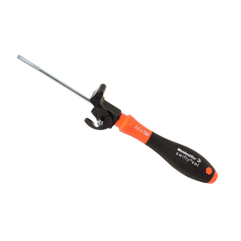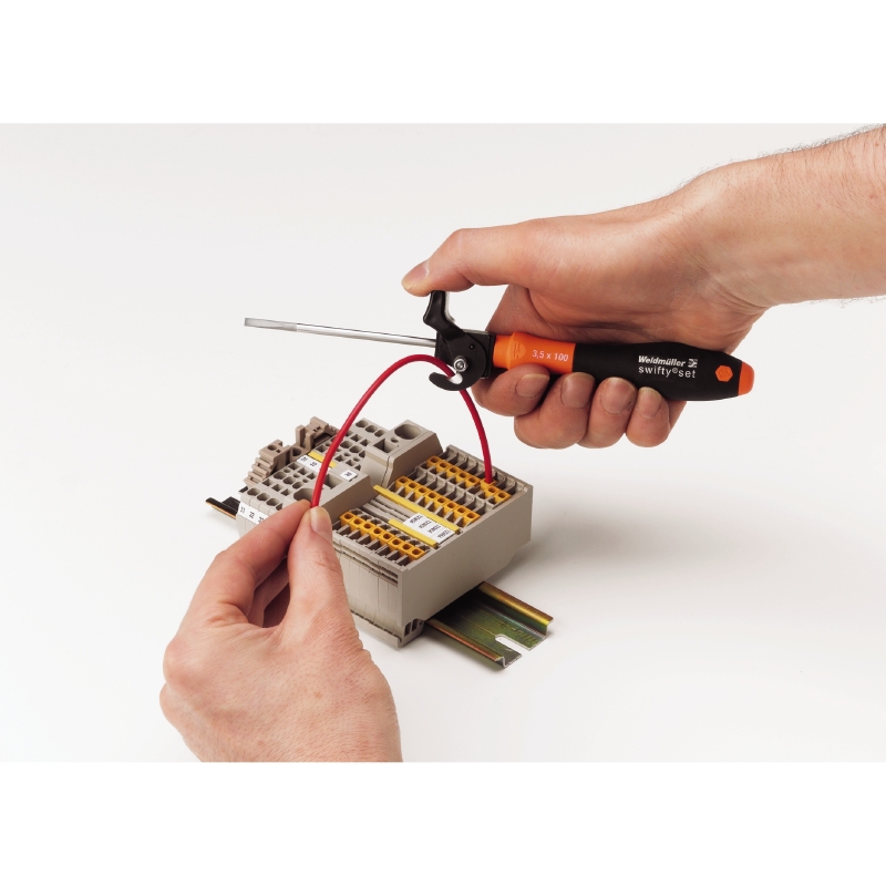 Herramienta de atornillado y corte sin deformar cables de cobre rígidos hasta 1,5 mm² y flexibles hasta 2,5 mm². Para operación con una mano.