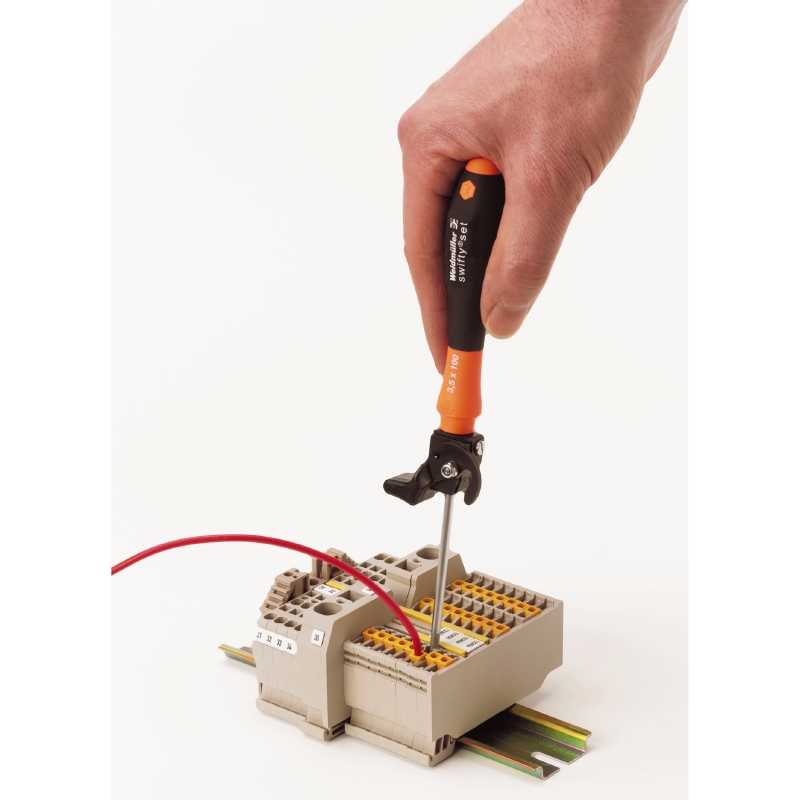 Herramienta de atornillado y corte sin deformar cables de cobre rígidos hasta 1,5 mm² y flexibles hasta 2,5 mm². Para operación con una mano.